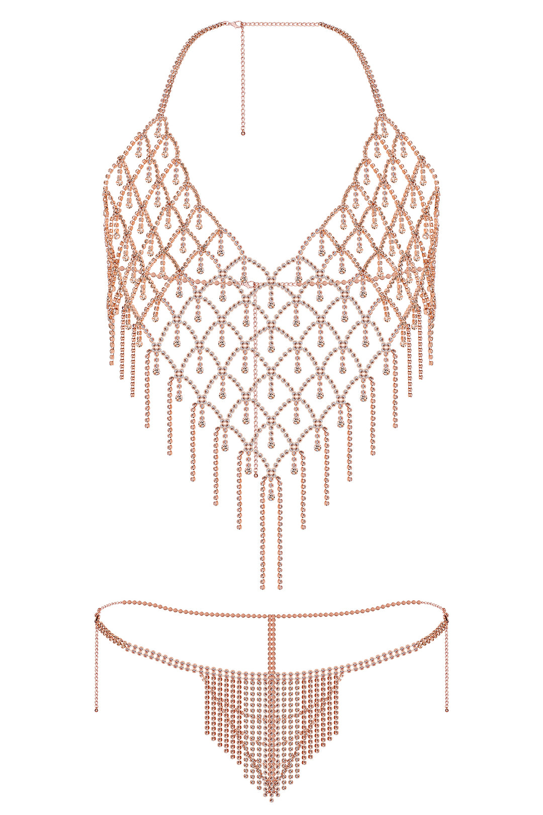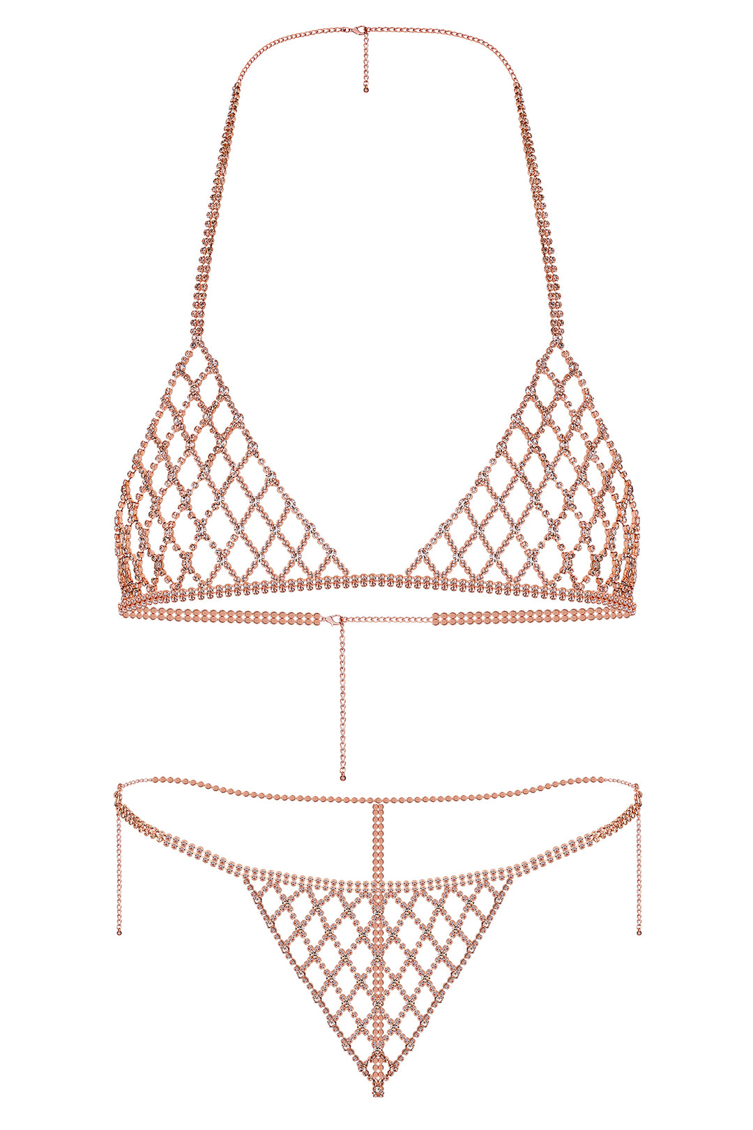 Conjunto de Lencería Sexy de 2 Piezas con Rejilla de Piedras Brillantes Oro Rosa