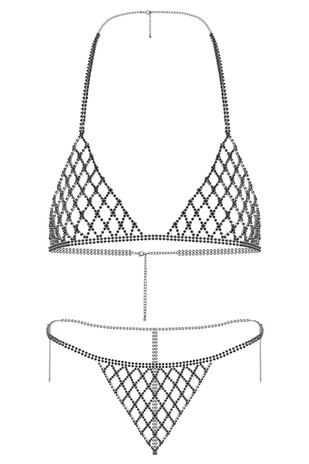 Conjunto de Lencería Sexy de 2 Piezas con Rejilla de Piedras Brillantes Plata
